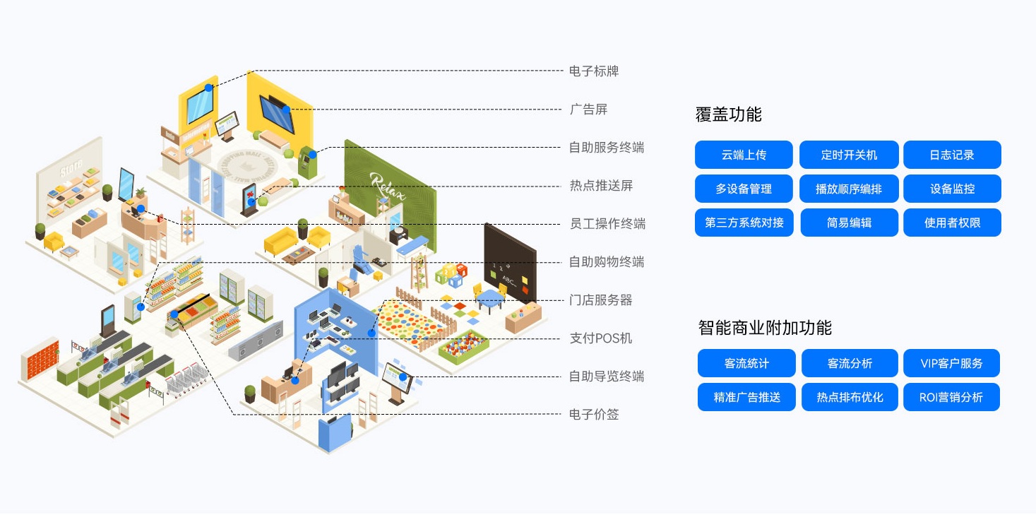 K8·凯发智慧零售解决方案搭配K8·凯发GDSM-ES智能零售管理系统,为全球零售门店客户提供了功能齐全的数字化运营管理工具,提供广告显示信息编辑、信息发布、AI识别、客户分析和会员管理等功能,实现对设备、内容、营销、运营的综合数智化管理能力,为精准运营管理赋能。