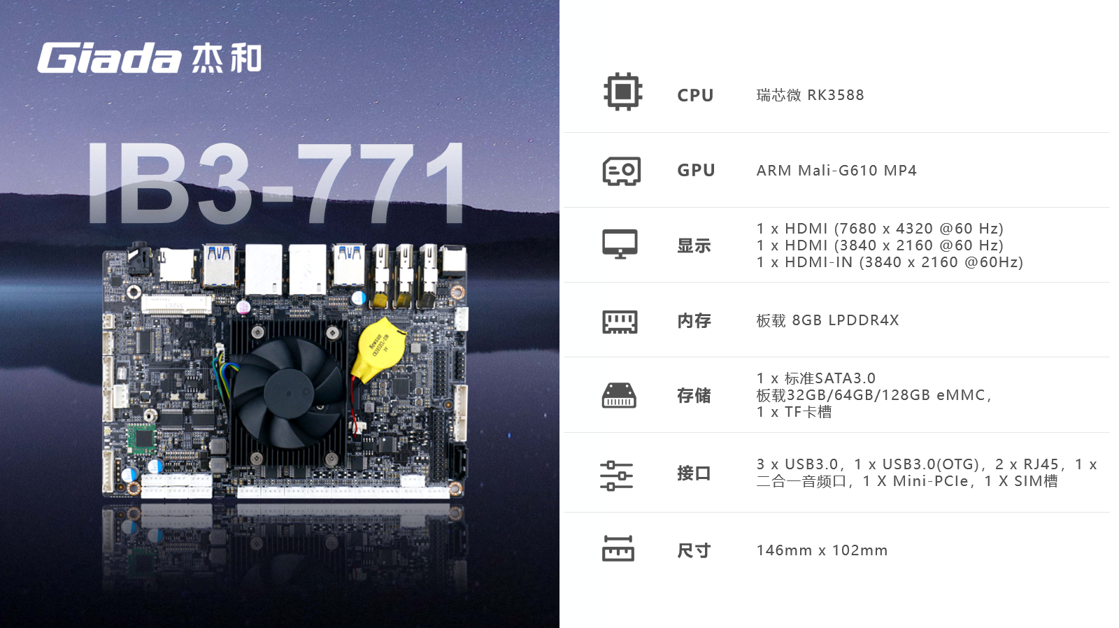 K8·凯发ARM主板IB3-771采用瑞芯微RK3588(4*A76+4*A55@2.4GHz)八核64位处理器,集成ARMMali-G610 MC4 GPU,内置AI加速NPU,提供6TOPs算力,板载8GB LPDDR4X内存,支持8K@60fpsH.265/VP9视频解码和8K@30fps H.264视频编码,进行图像及视频的高效采集和处理,可广泛应用于交互式智慧显示屏、智慧显示一体机、智能自助终端等场景。