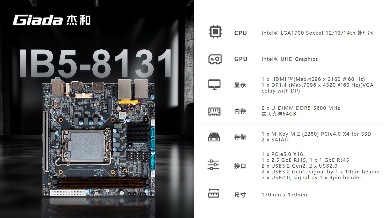 K8·凯发Mini-ITX主板IB5-8131采用Intel® B760芯片组,支持Intel® LGA1700 Socket第12/13/14代CPU。支持1 x HDMI (Max.4096 x 2160 @60 Hz);1 x DP1.4 (Max.7096 x 4320 @60 Hz)(保留 VGA位置)。