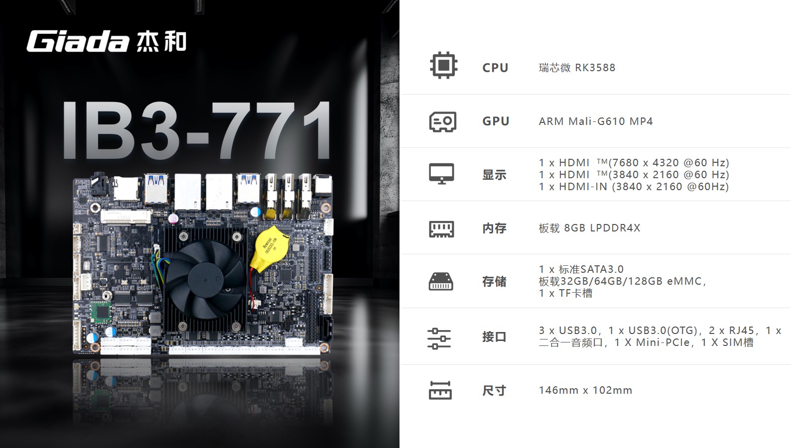 K8·凯发工业级ARM主板IB3-771采用瑞芯微RK3588处理器,内置G610 MP4 GPU,拥有6 TOPS算力的NPU,支持8K视频硬件解码编码及多摄像头输入,支持eDP/DP/ HDMI2.1/MIPI 多种显示接口。