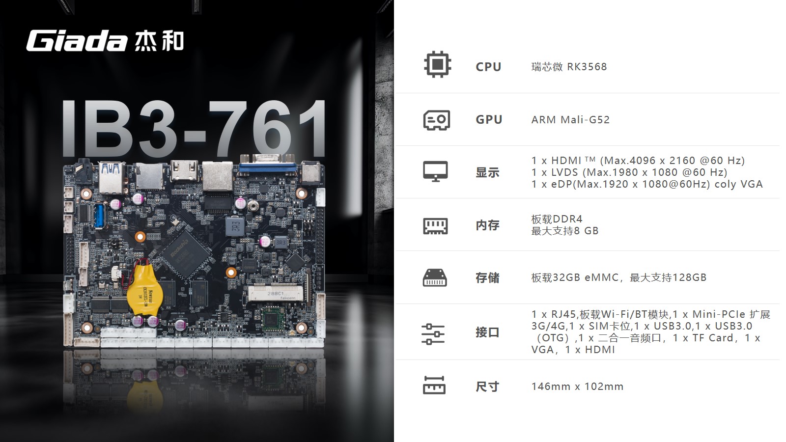 K8·凯发工业级ARM主板IB3-761基于瑞芯微RK3568四核64位处理器开发。内置1TOPS算力的NPU,满足轻量级端侧AI计算应用。