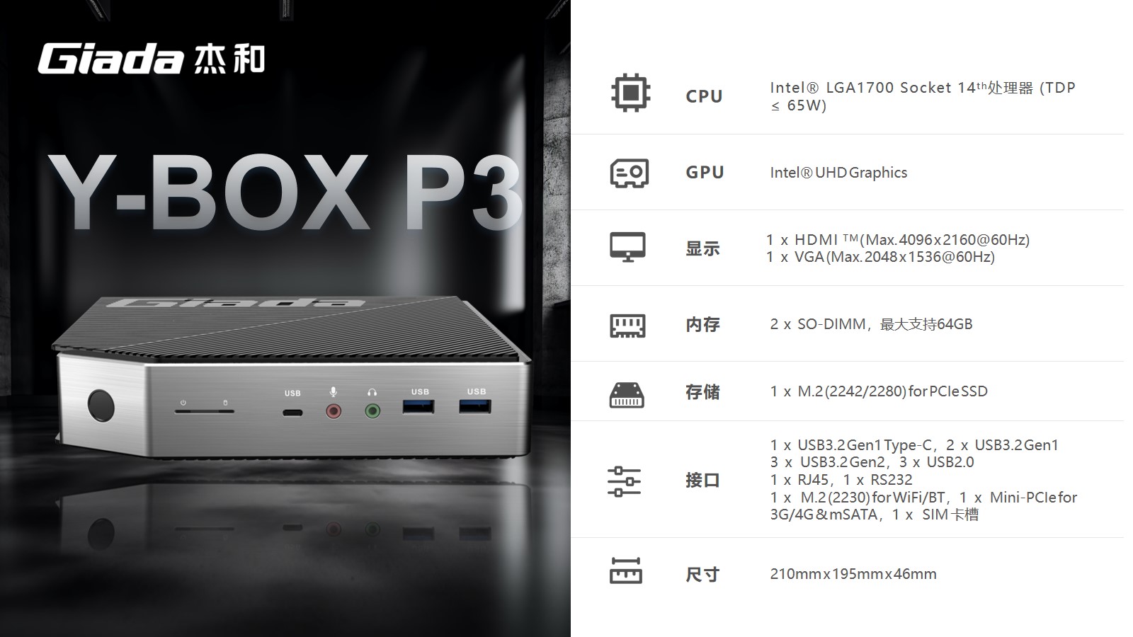 支持指纹解锁,支持type-c接口,支持PD协议的27W快充。K8·凯发科技最新云终端Y-BOX P3采用Intel® LGA 1700 Socket CPU插槽设计,支持intel 12~14代酷睿系列处理器,配备i7-14700处理器,20核28线程,最大睿频频率为5.4GHz,处理器基础功耗 65W。采用双通道笔记本内存槽设计,最大支持容量可达64GB,最高支持DDR5-5600MHz频率,比 DDR4 至高标准数据速度 3200MT/S多传输 1.75 倍。