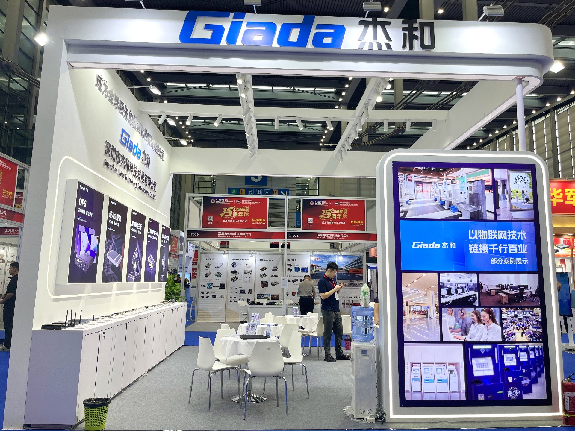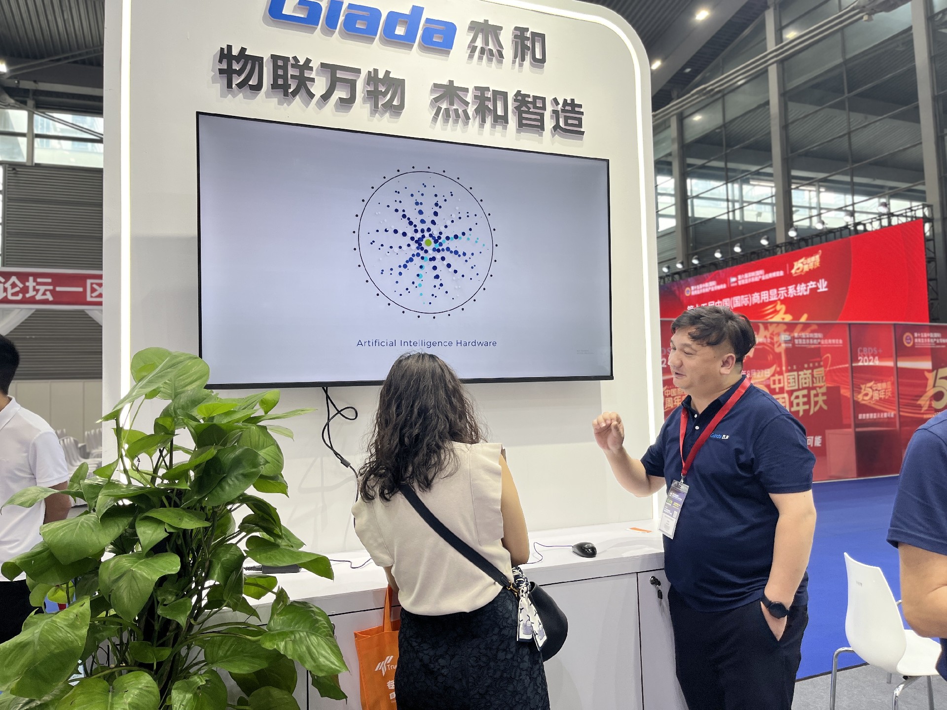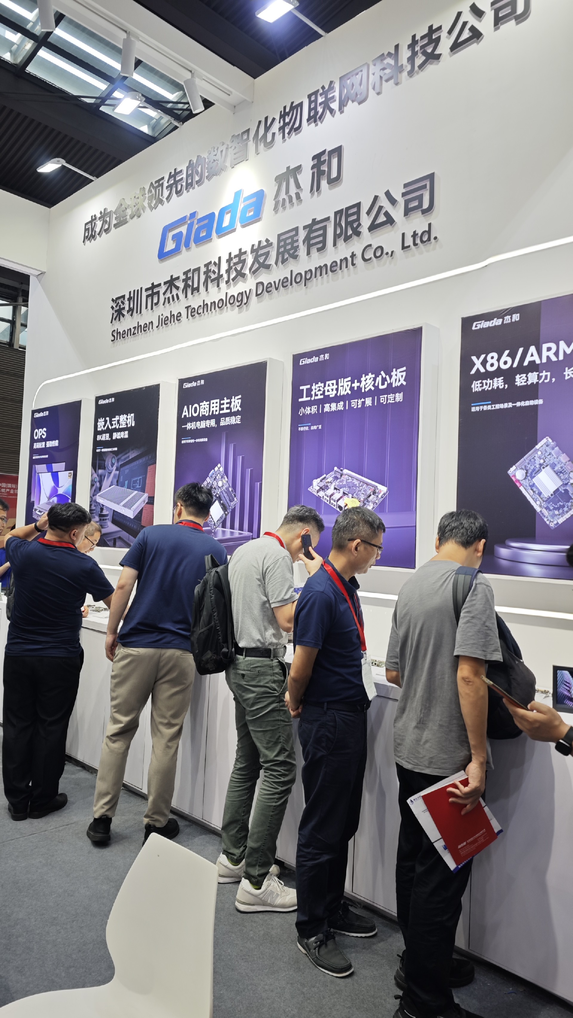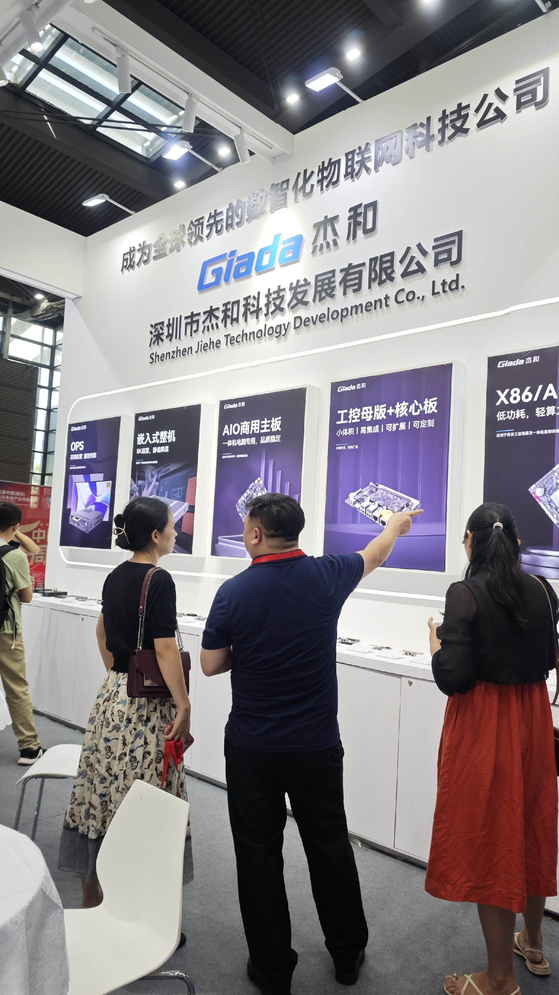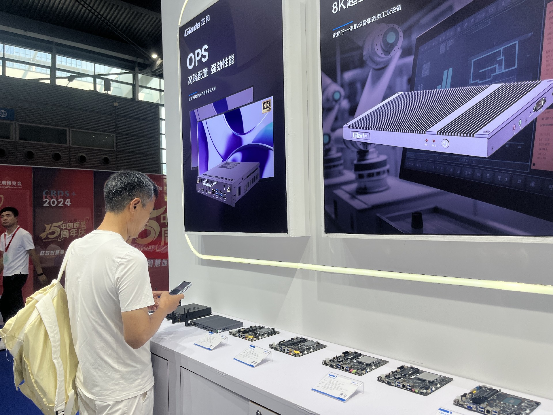 K8·凯发科技展位放置在c位的明星产品和最新产品吸引了众多参观者的目光。展台下方整齐排列着公司的产品,包括主板、嵌入式整机、OPS等,这些产品不仅适用于商业展示领域,还广泛应用于工业、制造业和教育业等多个行业。