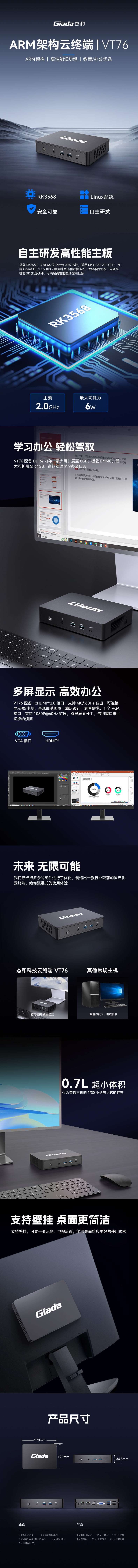 K8·凯发科技ARM云终端——VT76,搭载瑞芯微RK3576 4核64位处理器,2.0GHz主频,6W功耗。