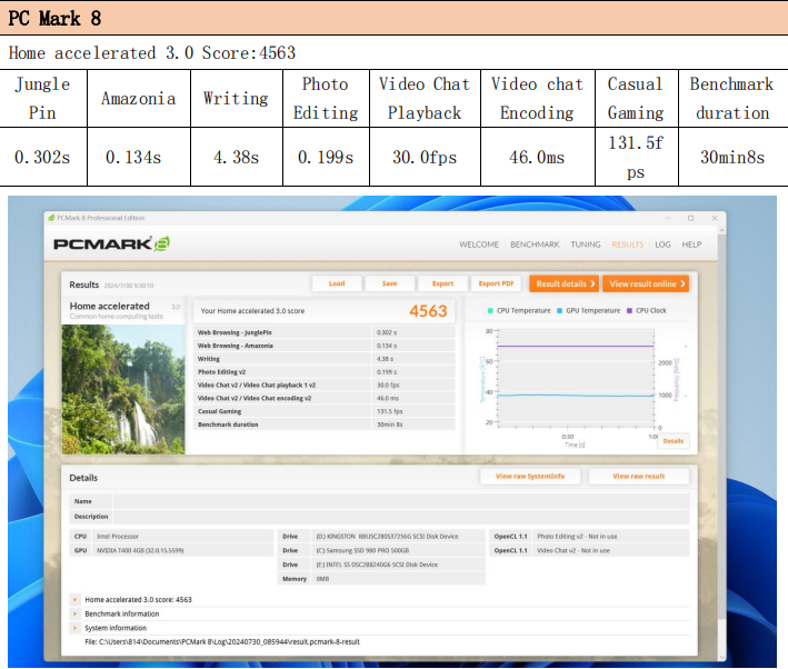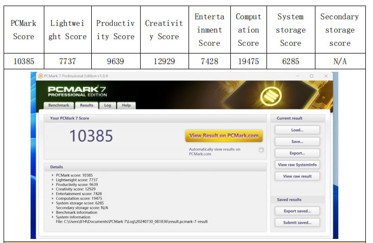 系统综合性能方面,WA814同样表现出色。PCMark 7总分10385,PCMark 8得分4563,PCMark 10得分5736,说明它不仅能应对复杂应用程序,还能胜任高效率的多任务办公。