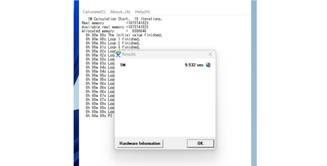 为了评估 CPU 的性能,凯发集团使用了Super PI 1.1 进行了测试,软件以用时为参考成绩,花费时间越短代表计算性能越强。在本次测试中,Core i5-13400 处理器用时 9.532 秒完成了计算,属于当前中端处理器的主流水平,足以应对日常编码、分析和轻量建模任务。