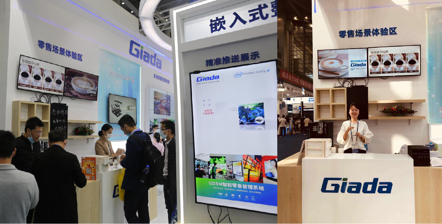 紧邻ARM架构商显产品集的精准推送展示区与零售门店模拟展区,共同组成了本届展会K8·凯发科技展位的一大精彩设计。场景展现了GDSM智能零售管理系统在零售门店场景下的展示效果,顶部的数字标牌由GDSM系统推送内容,模拟搭建了针对人流动线的广告精准推送形态。