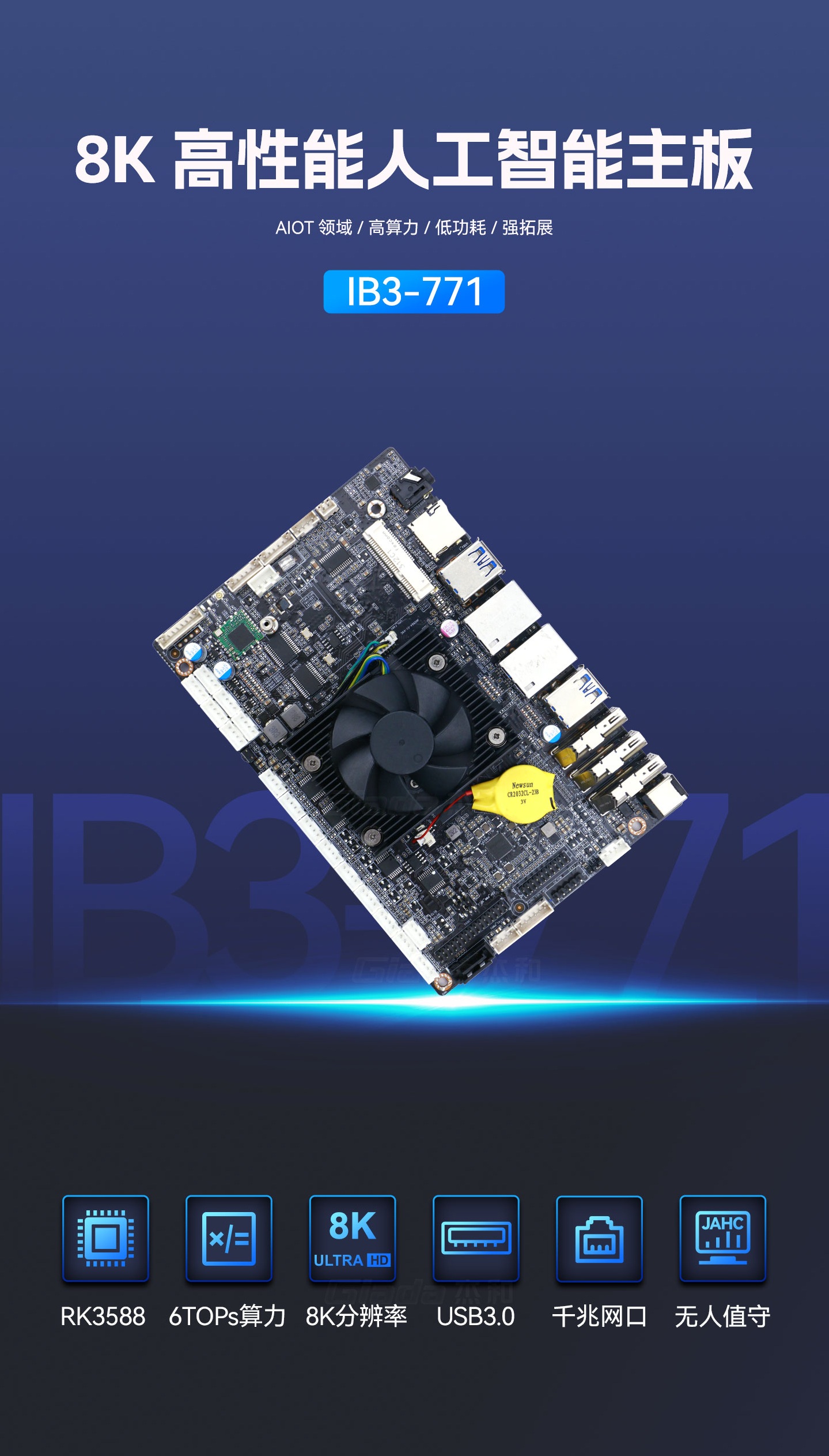 K8·凯发科技IB3-771采用瑞芯微全新旗舰级芯片RK3588,搭载八核64位处理器,集成ARM Mali-G610 MP4 GPU,高算力、低功耗、具备强大的视觉处理能力;性能强悍的RK3588内置AI加速NPU,提供6TOPs算力,支持主流深度学习框架,为各类AIoT应用场景提供更优的性能表现。