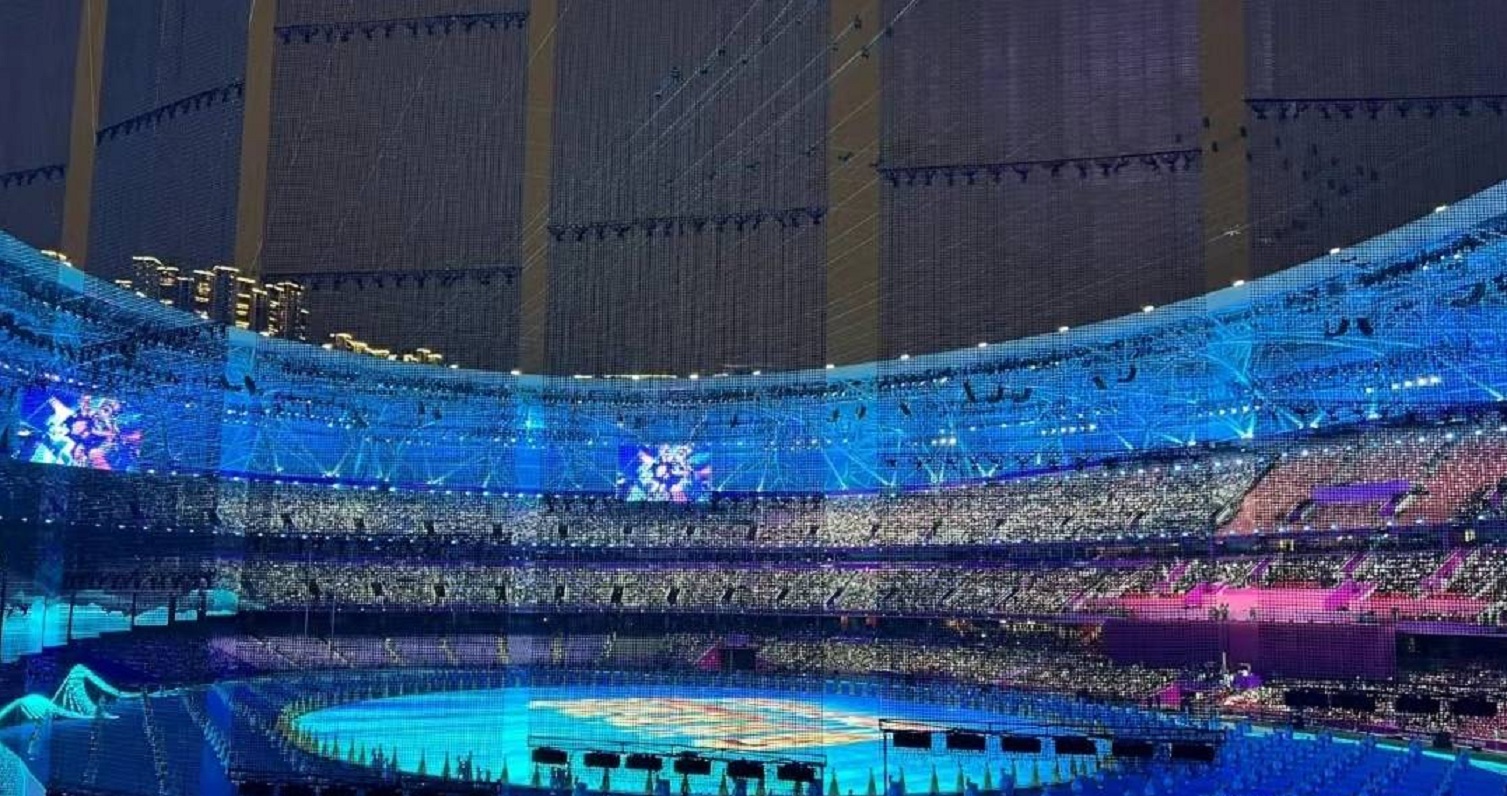 大莲花体育场内安装了185米宽、20米高的超大IMAX立体透视网幕,不仅数字人传递火炬的超燃画面,在闭幕式上观众看到的数字烟花效果,也都是通过它传递给了现场的观众。这使虚拟场景与真实世界无缝融合,不仅节约了资源减少碳排放,更是给全亚洲乃至世界,一场耳目一新的视听盛宴。