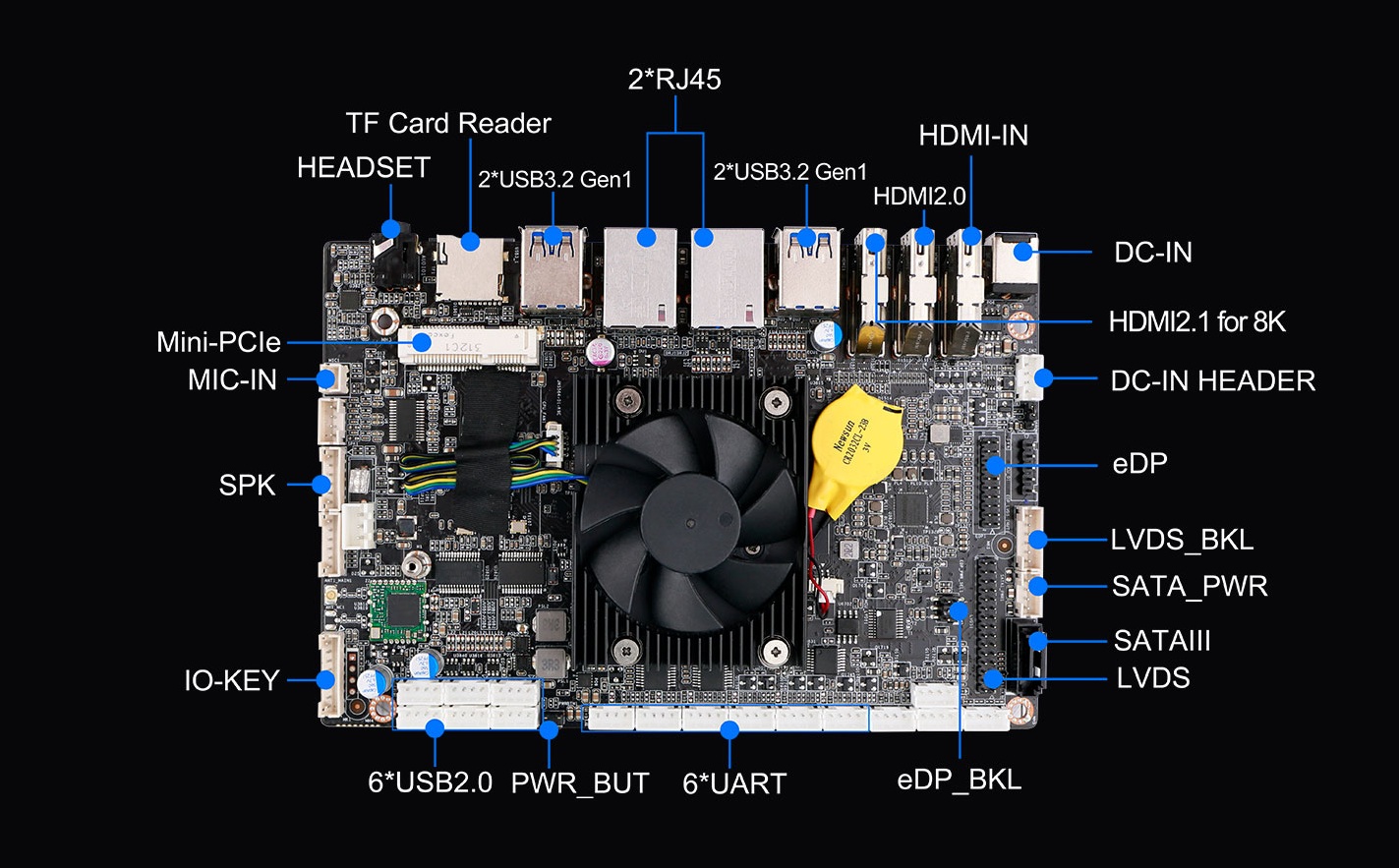 IB3-771支持双路千兆以太网RJ45,支持蓝牙BT模块,支持2.4GHz/5GHz双频WiFi6,支持1 X SIM槽,板载1 X Mini-PCIe卡槽支持扩展4G网络模块,具有灵活的网络应用环境,让网络通讯更稳定的同时,实现更高的通讯速率;支持3 x USB3.0,1 x USB3.0(OTG)接口,支持1 x 二合一音频口,内部接口支持6 x USB2.0,1 x eDP,1 x LVDS,1 x MIPI-CSI jack,2 x RS232 header, 2 x RS485 header,2 x TTL,1 x IO-KEY, 1 x IR,1 x MIC-IN,1 x SPK等接口,丰富的I/O功能接口,实现更多功能扩展。