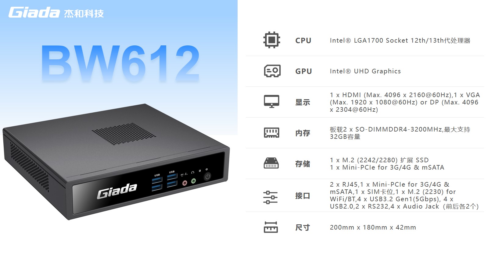 BW612采用lntel@LGA1700Socket 12代、13代处理器,比上一代 BW611计算性能提升约 23%,更强算力带来更强体验。主板多层板设计,配备超高品质被动元件,支持赛扬、奔腾等多种处理器定制,可选择 Windows7、Windows10 等操作系统。具备便捷管理部署、性能强悍、扩展性强、安全性高等优势,使用Intel UHD Graphics,支持高达4K@60Hz的分辨率双屏输出。可实现拓展、复制、独显模式的自由选择,享受清晰细腻的画面效果的同时实现高效的多任务处理,为使用者提供高清流畅的桌面体验。
