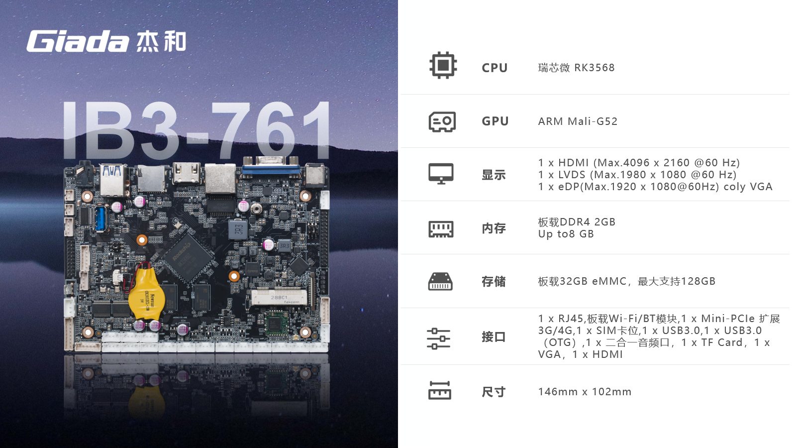 K8·凯发ARM主板IB3-761基于瑞芯微RK3568四核64位处理器开发,可实现多任务并行、更大数据集的高效处理,丰富的接口,具有性能强、内存大、集成度高、扩展能力强等特点,在处理速度和图形处理能力方面都表现出色,可广泛应用于物联网网关、边缘存储、工控平板、工业检测、工控盒、自助终端、云终端、车载中控、机器人等行业定制市场。